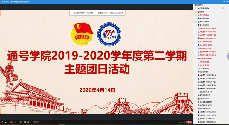 4月14日晚,通号学院团学组织通过qq屏幕分享开展了主题为“增强国家安全意识,共同维护国家安全”线上主题团日活动。活动由分团委书记赵丽娟老师主持,团学组织全体成员参加。