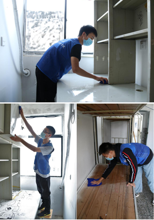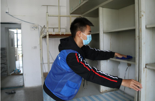 2020年10月8日下午13:00,招募的80名志愿者在模拟站台集合,活动负责人对本次“大清洁”提出高标准、严要求,并将打扫任务责任到人,落实学生干部检查机制,确保本次打扫活动能高质量完成。随后,志愿者们对位于1栋、2栋、5栋的新生宿舍进行了彻底清扫,着重针对床铺,洗漱池,阳台拐角,橱柜上层缝隙以及寝室地面进行清洁,志愿者们不怕脏不怕累,不放过任何一个死角,在大家的共同努力下,新生宿舍焕然一新。