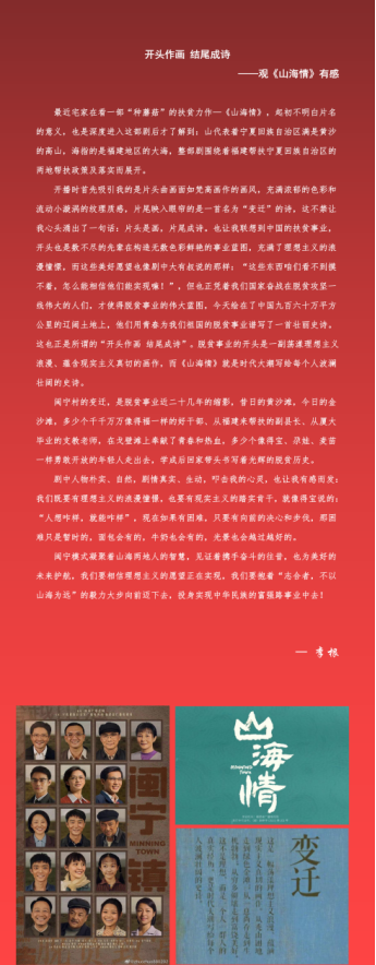 “志合者,不以山海为远”。电视剧《山海情》,以朴实动人的笔墨,讲述了20世纪90年代以来,宁夏西海固的移民们在国家政策的号召、福建的对口帮扶下,不断克服困难,将飞沙走石的“干沙滩”建设成寸土寸金的“金沙滩”的故事。故事以朴实、接地气的叙事风格和温情细腻的视角,生动形象地描绘了基层扶贫干部带领老百姓脱贫致富的历史画卷与款款深情。它使我们看到,原来脱贫攻坚这四个字,也能绘制成一幅激荡理想主义浪漫又蕴含现实主义真切的画作,而这剧里的所有故事所有人、所有山水所有路,也都在一顿一挫地说着:只要根须扎得进三尺厚,飞沙黄土也拔得出万千生机。你们瞧啊!这,就是中国。