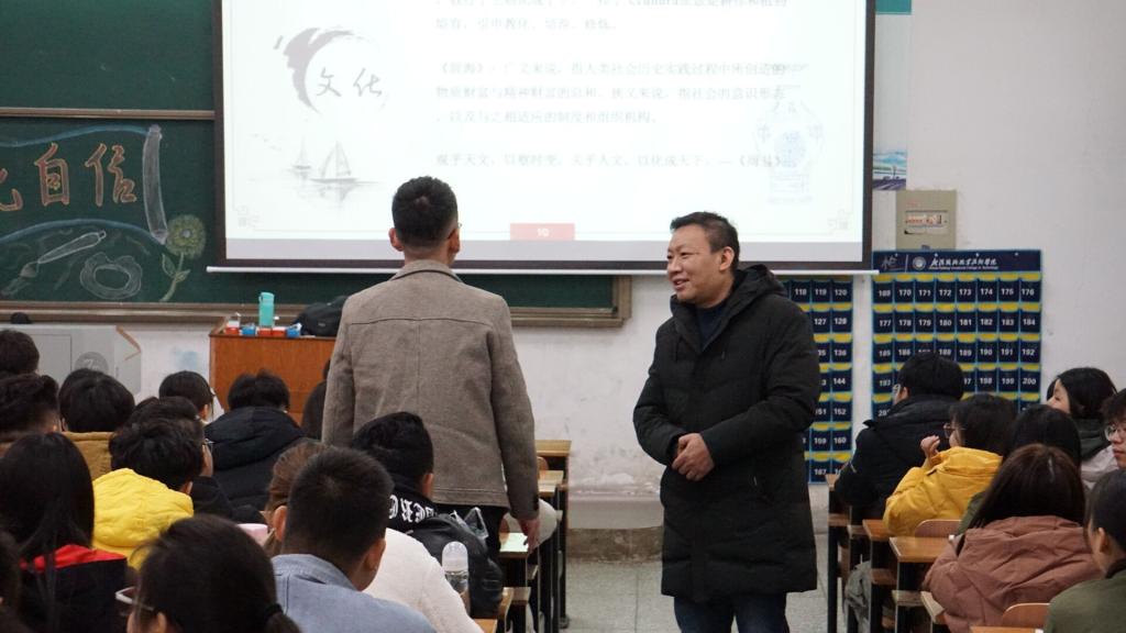 翟均林老师还将有关“文化自信”的理论知识结合同学们的日常生活娓娓道来,使同学们更加深切地感受到了文化自信的理论不仅是一种理论,更是在客观分析国情的基础上形成和发展起来的。翟老师进一步举例说明文化自信的理论不是文化堆砌,而是来自中国的实际情况和中国共产党的斗争经验的总结、转化和升华。