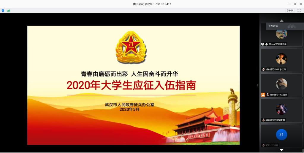 为了深入贯彻落实教育部、中央军委国防动员部关于全国大学生征兵工作相关精神,积极响应国家征兵的号召,巩固防建设,不断为军队注入新鲜血液,6月2日,铁道通信与信号学院各班级举行了2020年征兵动员云班会。