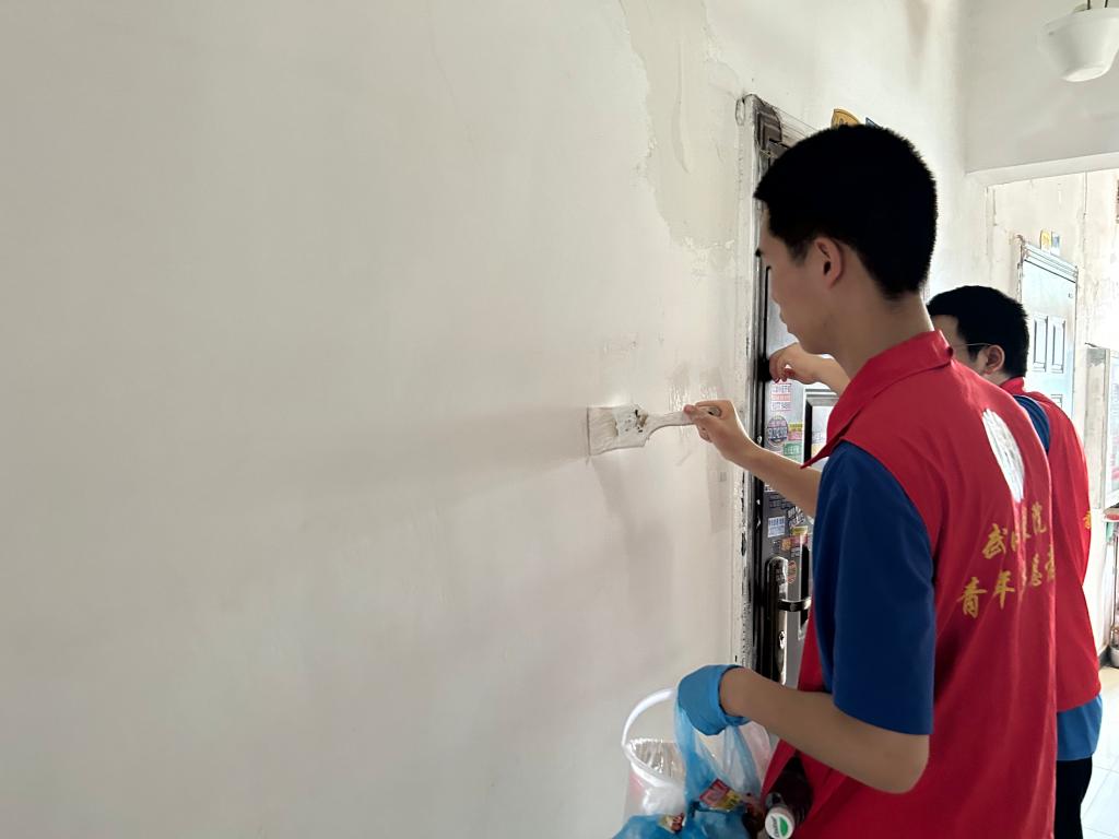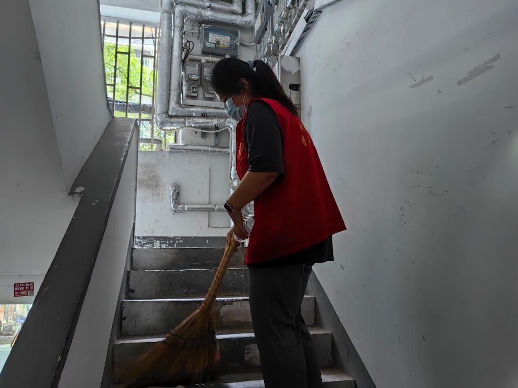 随后,工作人员带领志愿者们踏着朝露乘坐公共交通工具来到正康社区。随后进行工作对接并分发劳动工具,明确本次活动的具体清洁区域。接着,工作人员将志愿者分成了两组进行不同的任务活动。第一组同学在华美小区居民楼内进行清洁打扫工作,并用油漆仔细地涂抹墙壁上的“牛皮癣”,还将砖头砖块等危险物品搬离居民区。