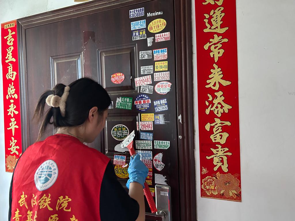 紧接着,第二组同学在社区工作人员的带领下前往海联时代广场进行清除小广告工作,门上的广告“牛皮癣”很多,在志愿者齐心协力之下终于清除了所有的小广告,还社区一个干净整洁的环境。最后,志愿者们回到正康社区居民委员会,与工作人员进行热情地攀谈并在门口合影留念,记录这个美好的瞬间。