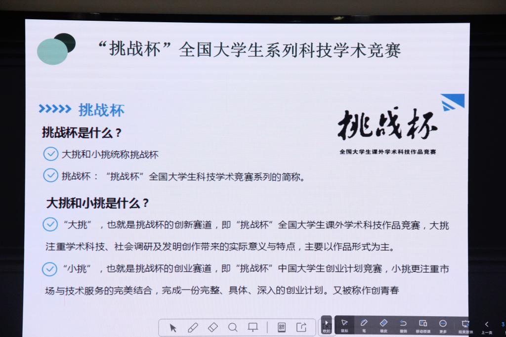 活动伊始,赵老师从同学们最常见的“挑战杯”全国大学生系列科技学术竞赛、中国国际大学生创新大赛和“振兴杯”全国青年职业技能大赛三个大赛入手,分别从参赛对象、竞赛方向进行了详细的讲解。其中,着重强调了创新性,商业性和团队性的重要性。最后,为同学们介绍了学校及学院各具特色的创新创业基地。