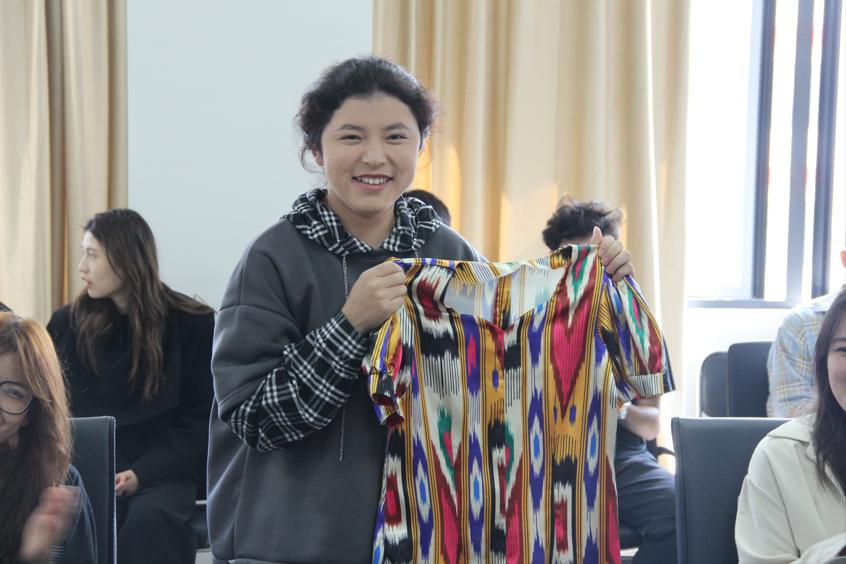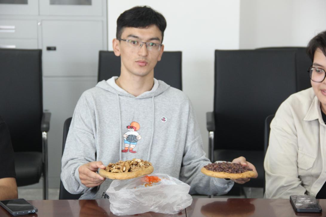 座谈会上,孙方正老师带领同学们学习习近平总书记在全国民族团结进步表彰大会上的重要讲话,共同回顾了我国民族团结进步事业所取得的辉煌成就。随后,同学们分别进行了自我介绍,方便24级的新同学更快地融入大家。在相互认识之后,城轨通号 12201 班的古丽努尔·麦麦提艾力展示了维吾尔族的特色民族服饰艾德来丝;铁道供电 12304 班的艾力亚斯尔·麦麦提敏热情地邀请在场的老师同学们品尝新疆的馕,铁道通信 12302 班的古再丽努尔·牙克甫同学分享了自入校以来的感受以及遇到的困惑,学院领导、老师认真聆听,一一记录,给予了耐心的解答和鼓励,现场交流气氛热烈,氛围轻松愉快。