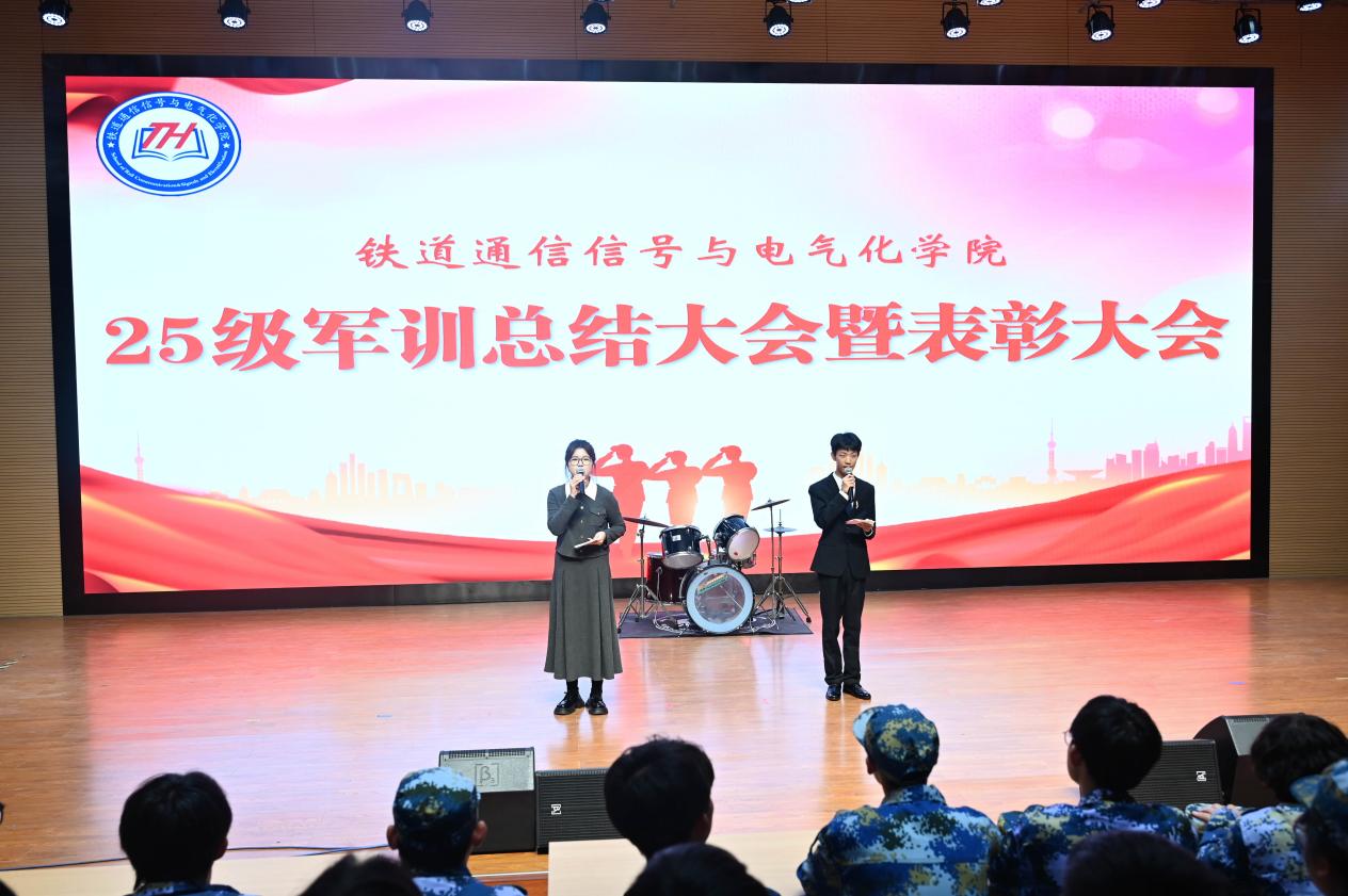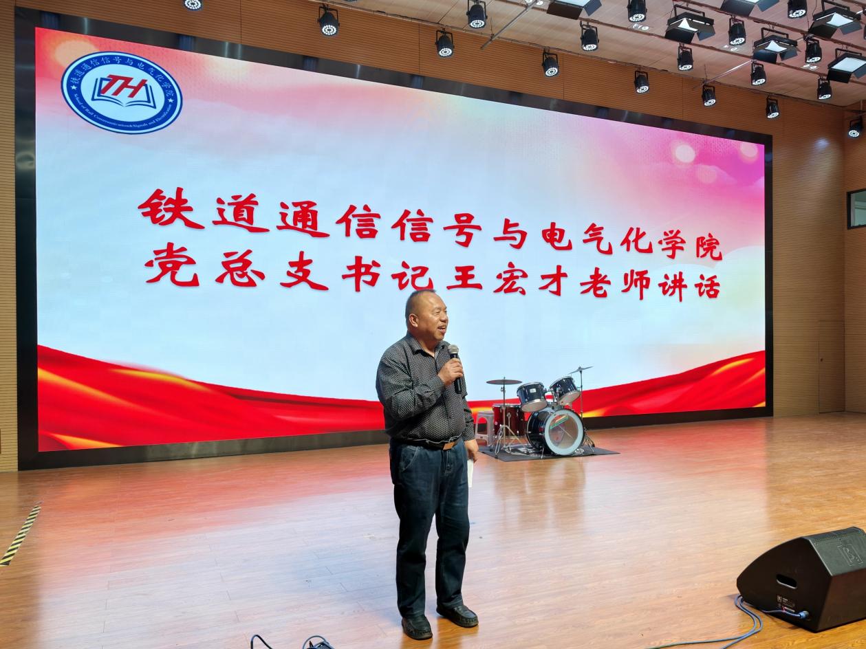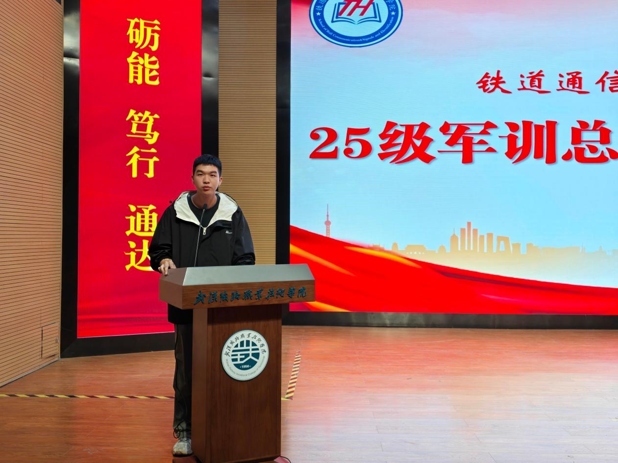 学院党总支书记王宏才在致辞中高度肯定了新生们在军训期间的表现。他指出,军训充分展现了同学们的纪律意识,风雨中的坚持更彰显了意志品质。王书记强调“总结是二次学习”,勉励大家将军训中锤炼的“铁的理想信念、铁的纪律作风、铁的意志品质、铁的担当作为”融入日常学习,为投身国家铁路事业筑牢根基。