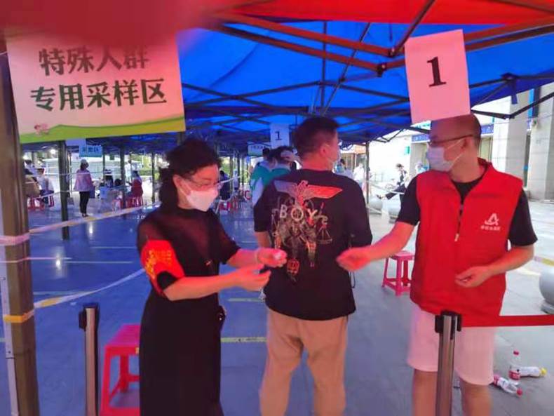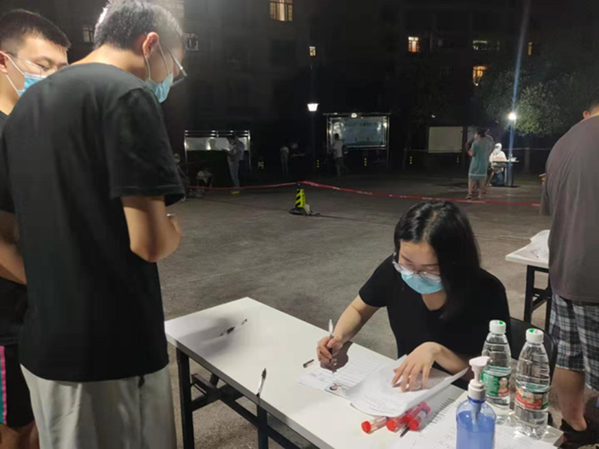 教工第二党支部书记罗明玉同志带头下沉社区,参与纺织大学门岗值守,体温检测、来访登记;陈瑞同志主动参加湘龙鑫城社区两次全员核酸检测工作,协助引导维护现场秩序,参与社区全民核酸检测率排查,累计志愿服务达25工时;王琳、黄丽、张曜同志在下沉社区积极参与引导居民采样、体温检测、来访登记等工作,并及时帮助困难群众,做好信息告知;鄢江艳同志7月生病住院,也积极响应党的号召下沉社区参与核酸检测工作。