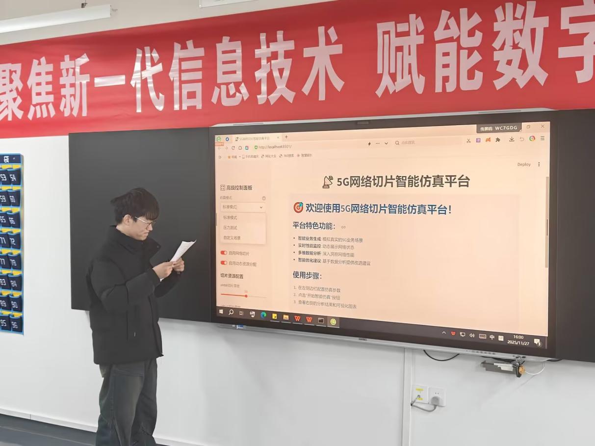 活动共有21支团队、75名学生报名参与,各团队聚焦新一代信息技术、5G通信、网络结构、行业应用等内容,搜集最新行业动态,制作展示材料。经初步筛选,确定10支队伍,于11月27日在立德楼408开展现场展示的决赛环节。评委老师针对新一代信息技术及行业应用案例中的技术问题进行提问,并和参赛学生开展研讨。