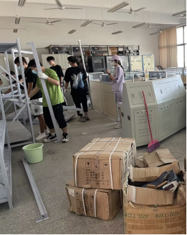 同学们分工合理,有效配合,有的负责地面、窗户卫生,有的负责实训物资整理、有的负责实训设备的维护,大家在实训室里忙的热火朝天。怀有身孕的肖曼老师也带头整理,一边忙手头工作,一边反复提醒同学们注意安全。