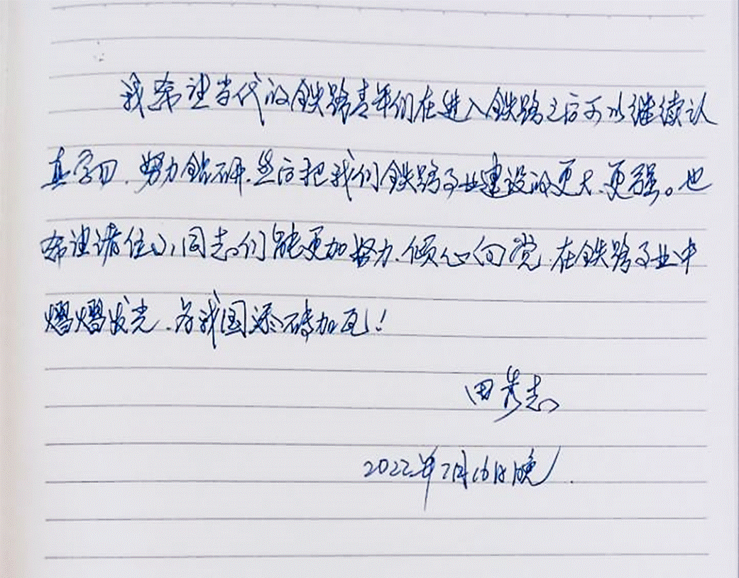 最后,田爷爷给我们当代铁路学子们写下了祝福和希冀。他说,希望我们的铁路建设越来越好,也希望我们锻炼好身体,为铁路事业贡献力量。