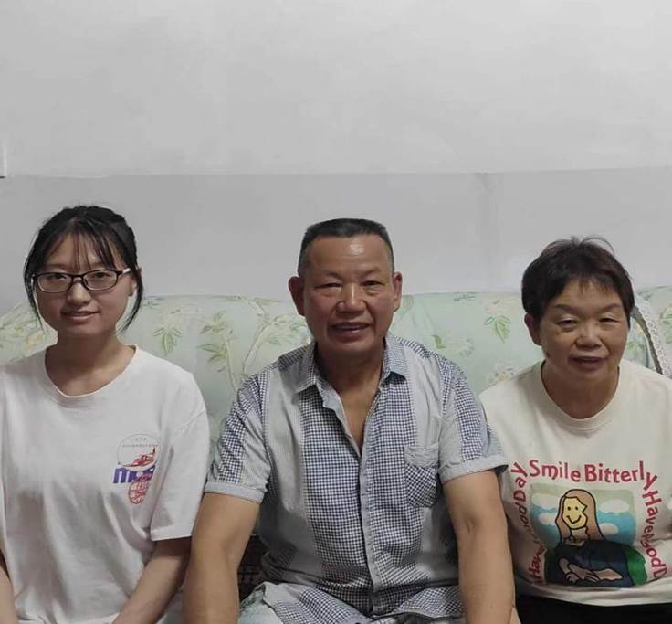 图为团队成员游云与田爷爷、田奶奶合影留念