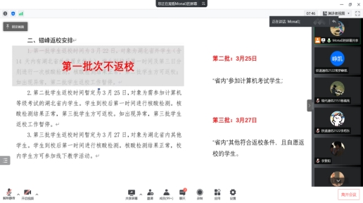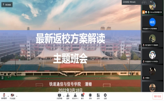 3月18日晚-3月19日,铁道通信与信号学院各班级纷纷召开了线上主题班会,为同学们详细解读了《关于2022年春季学期学生返校的通知》。老师们对当前全国疫情进行了分析,引导同学们充分认识当前阶段疫情防控工作的重要性和紧迫性。随后对学校疫情防控期间学生返校工作进行了详细解读,明确了符合返校条件的同学和返校前的各项工作要求,并提醒同学们在返校期间做好防护,加强自我保护意识;对暂缓返校的外省同学进行了心理安抚,引导同学们继续扎实做好居家学习,积极参与通号学院“我用劳动来感恩”线上劳动打卡活动充实自己的居家生活,加强身体锻炼,调节身心,保持健康心态。最后,老师们对学生进行了细致的线上答疑,并引导同学们理解学校疫情防控工作调整的初心,相信不久就能相逢在铁院。