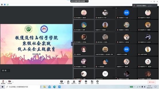1月6日晚,铁道通信与信号学院召开2022年寒假社会实践线上安全主题教育。通号学院团委书记赵丽娟、各团学组成人员、各班团支部成员、各年级学生代表等参会。本次会议由学院团委学习部负责人龚道文主持。