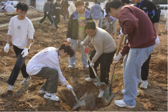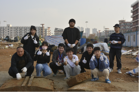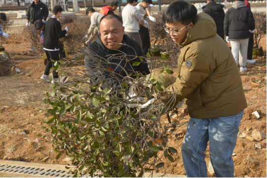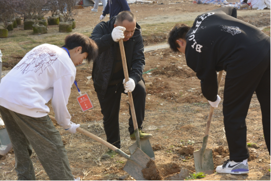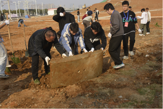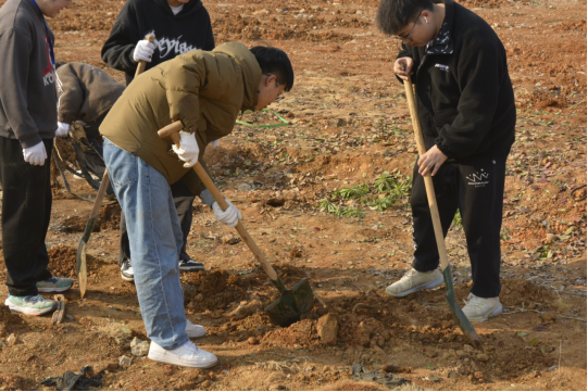 活动伊始,待人员集合完毕后由勤工助学部工作人员带领学生前往学校仓库领取工具,统一拿到劳动场地。紧接着,每人领取手套和铁锹,同学们在王书记和孙老师的带领下进行了树苗的搬运并且清理种植场地。在接近一个小时的打扫活动中,老师与同学们齐心协力,认真清理种植场地的杂物与石块。一块块硕大的石头不但没有压住同学们的劳动热情,反而激发了大家团队协作的力量。随后,王宏才书记和孙方正老师进行了总结发言,理论知识是基础,但只有与实际相结合,才能发挥最大的效用。通过种地劳动,学生可以将课堂上学到的知识付诸实践,更好地理解和掌握。这不仅增强了教学效果,更让学生在实践中发现了新知,同学们听后纷纷表示赞同并且希望以后能参加更多此类活动中。最后,全体师生合影留念并归还劳动工具。
