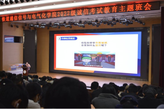 为了培养学生的诚信意识和责任观念,端正学生学习和考试的态度,确保全体学生严格遵守考试规章制度。1月4日晚和1月5日午,金年会jinnianhuicom(以下简称“通号学院”)于通达厅与厚德厅召开2022级和2023级诚信考试教育主题班会,由学院辅导员孙方正、汪晓语和胡向阳老师担任主讲人,22级、23级通号学院全体同学参与本次会议。2021级诚信考试教育主题班会由各班班主任在两天内组织开展。
