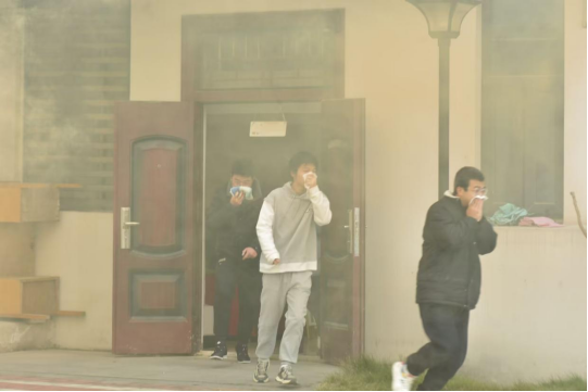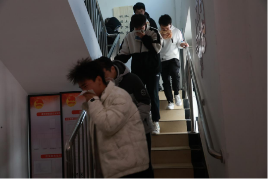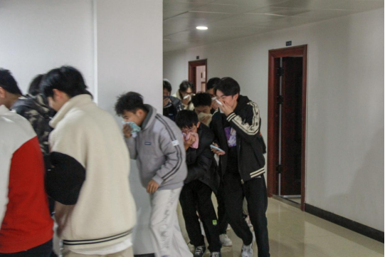 为保证演练安全顺利进行,学院成立了专门的火情应急指挥组,并制定了详细的消防应急指挥和疏散方案。演练伊始,为了模拟火情,学院利用烟雾弹模拟宿舍楼内发生火灾并拉响警报。随着一阵急促的警报声,消防疏散演练正式拉开序幕,假设宿舍楼二层起火,火势迅速蔓延,在老师和层长助理的引导下,各寝室同学沿着楼道、楼梯迅速通过各个安全出口,有序撤离到安全地带。随后,各寝室长对寝室人员人数进行清点,确保所有人安全到达指定地点。在整个消防疏散演练中,同学们按照火场逃生演练技巧,采用毛巾或衣角捂住口鼻,弯腰低姿沿着学院指定疏散路径有序前进,充分体现了良好的消防安全素质。演练结束后,党总支副书记周著荣老师对本次消防演练进行总结,高度肯定了此次消防安全应急疏散演练,表示同学们安静、迅速、有序地到达指定地点,做到了一切行动听指挥,并希望同学们日后多加强学习消防安全知识。