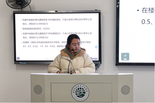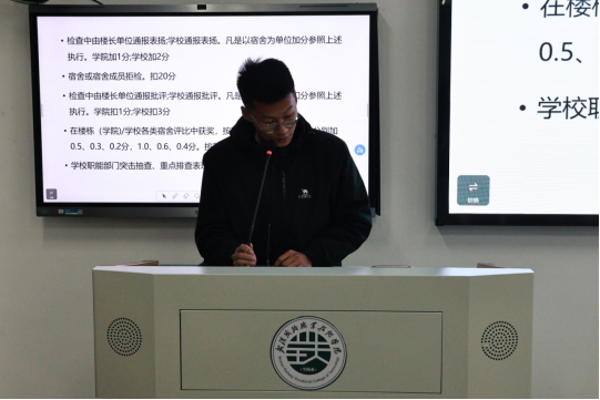 活动伊始,主讲人首先说明了星级宿舍检查内容及评定标准,总体要求达到“六净”“五无”“三整齐”。紧接着,主讲人说明了宿舍卫生管理的重要性及扣分和加分的标准,并着重强调个人所得分与学期末操行分息息相关,要求同学们重视星级宿舍的评定,并作出实际行动。最后,主讲人强调学院将贯彻落实日常普查、突击抽查、重点排查制度,把控宿舍无人带电、卫生等基础管理状况,对星级宿舍或不达标宿舍进行赏罚,对面临的问题及时反馈及解决,最大限度保证学生安全稳定。同时,主讲人希望全体同学能够携手并进,共同建立文明和谐校园,共同营造和谐舒适的宿舍环境。