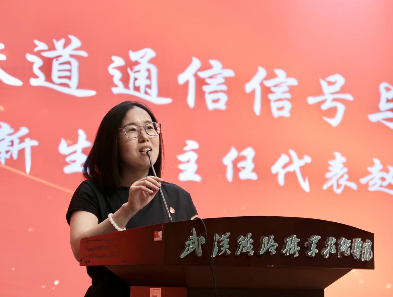 辅导员代表华桢老师则详细讲解了校训含义,传达了学院、学校和老师对同学们坚定的支持。表示会做同学们的坚实后盾,保障大家发展。同时,希望同学们怀揣梦想与志向,不断成长,心怀家国情怀,努力建设祖国。