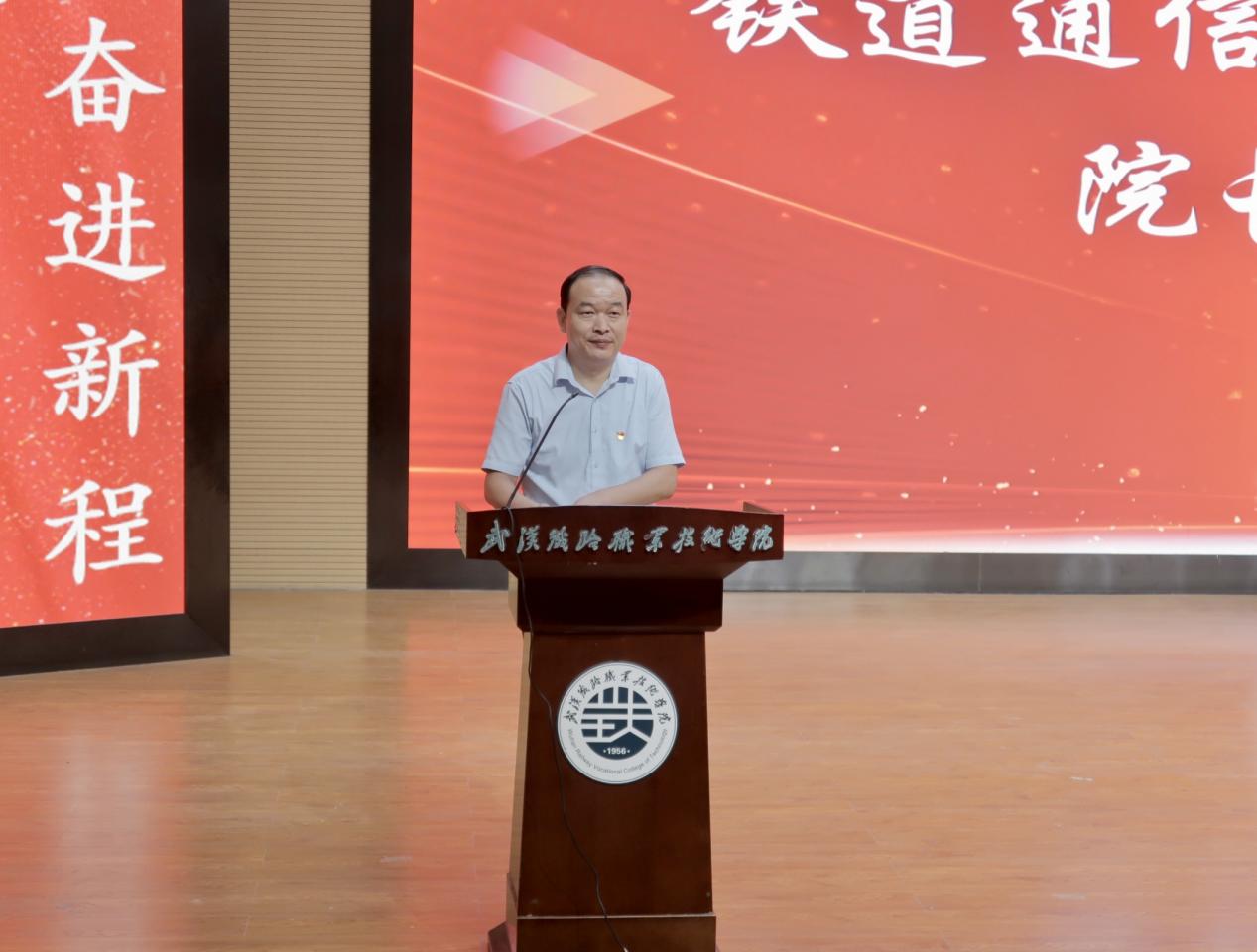 党总支书记王宏才总结了各位发言嘉宾的内容,再次强调了学习和生活的要点,希望同学们以优秀学生为榜样,全面发展,并加强安全意识。最后,新生集体宣读铁院校训,展现了同学们对未来的坚定信念。