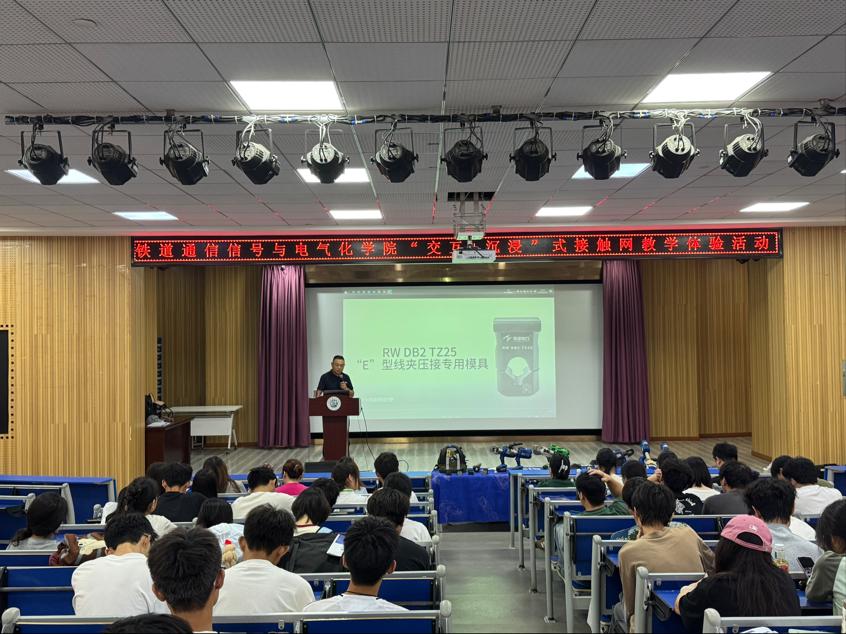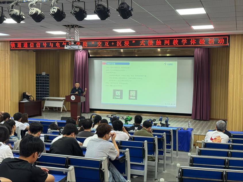 为普及接触网专业知识、提升学员实践能力、促进学科交流与行业人才培养。5月28日中午,通号学院于厚德厅举办“交互+沉浸”式接触网教学体验活动。本次活动特别邀请了在电气连接领域深耕多年的天泽电力公司进行演讲,为师生们带来了接触网领域的前沿知识与实践经验,铁道供电技术教研室教师、学院2023级和2024级供电专业学生参加。