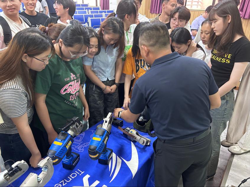 随后,同学们走到接触网专用工具前进行实地操作,近距离感受接触网的检修与维护流程。天泽电力的技术人员在旁耐心指导,针对操作中的问题进行细致解答,极大地激发了同学们的学习热情。互动交流过程中,同学们积极提问,就接触网技术的应用与发展等问题与专家展开热烈讨论,现场气氛十分活跃。