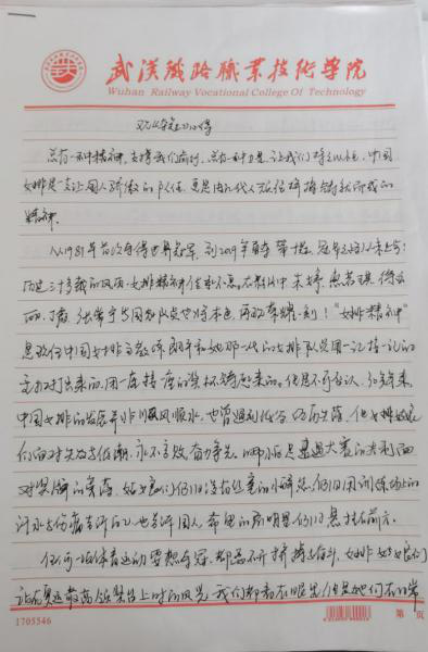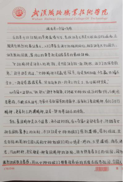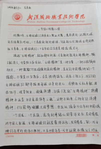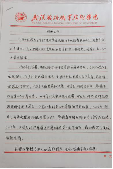 同学们书写了自己对女票精神的理解,比如“我所认为的女排精神便是未经世事的勇气,坚韧不拔的毅力,受到挫折的不服输,赢了比赛的英姿飒爽,还有时隔多年历经沧桑也不会改变的初心”,同时大家表明要传承女排精神,将这种自强拼搏和爱国信念转化成实际行动,把女排精神融入生活和学习中,不忘初心,砥砺前行。