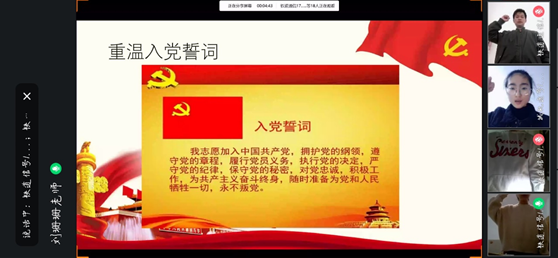 学生党支部全体党员齐聚线上共同参与此次活动,齐唱国歌、听取本月党费缴纳情况汇报。学生党支部的党员庄严起立,师生异地同屏,重温入党誓词。