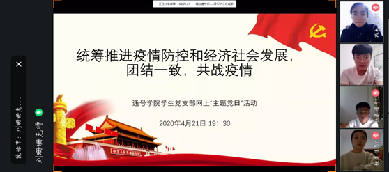 2020年4月21日19:30,通号学院学生党支部以“统筹推进疫情防控和经济社会发展,团结一致,共战疫情”为主题,通过QQ课堂,在线上认真开展了网上“主题党日”活动。