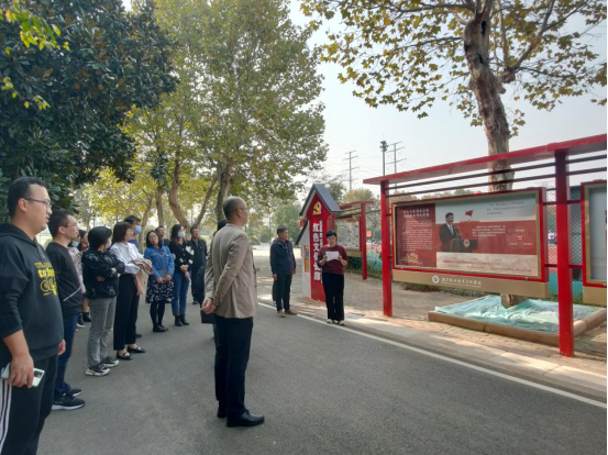 来到红色长廊,鄢江艳首先带领党员教师参观了红色长廊的全貌。红色长廊是武汉铁院“新时代火车头工程”党建品牌建设的阵地之一。长廊沿学校田径场南面而建,共设有27个橱窗,共36块宣讲版面。36块宣讲版面共分为四个版块,记载着党的光辉历程、时代精神、重大事件,记录着中国共产党由小到大,由弱到强的艰辛历程。鄢江艳介绍道,陇海路东侧9块展板内容主题为“党史故事”,选取了“真理的味道——‘非常甜’”等有趣有味的党史故事,图文并茂地向在校师生展示中国共产党领导全国人民不懈奋斗、不断奋进的光辉历史中平凡而鲜活的故事,激励师生们感党恩、听党话、跟党走。