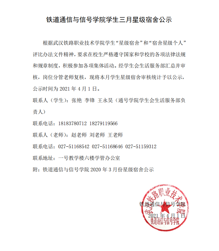 铁道通信与信号学院学生三月星级宿舍公示