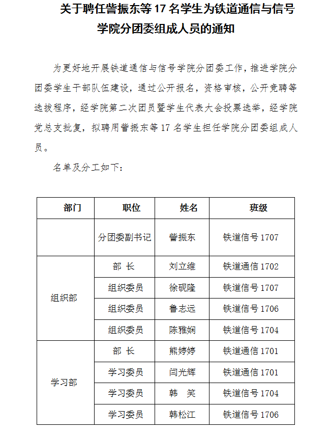 上一条:关于聘任赵欣等40名学生为铁道通信与信号学院学生分会组成人员的通知