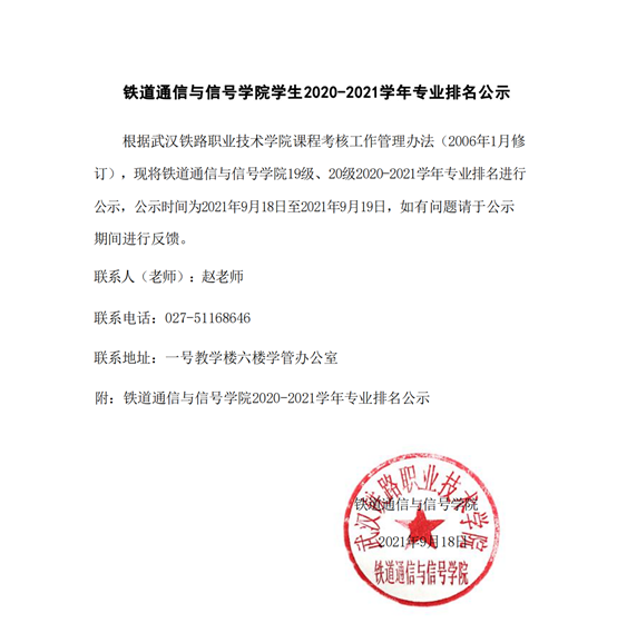 铁道通信与信号学院学生2020-2021学年专业排名公示