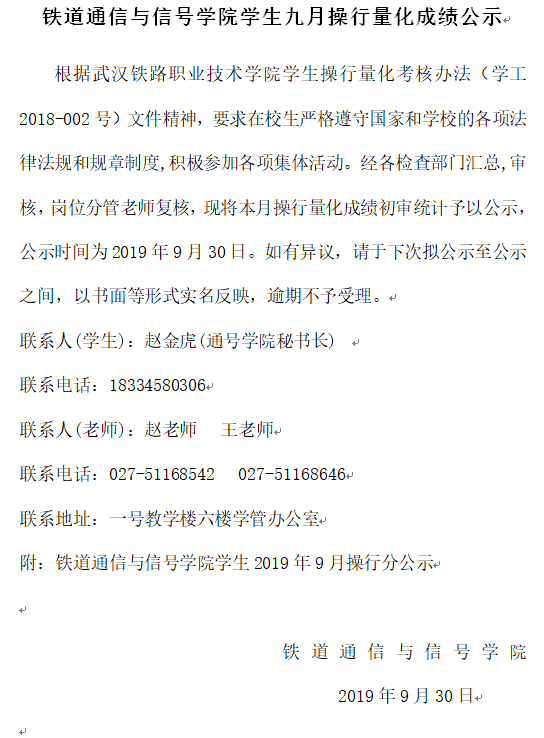 铁道通信与信号学院学生九月操行量化成绩公示