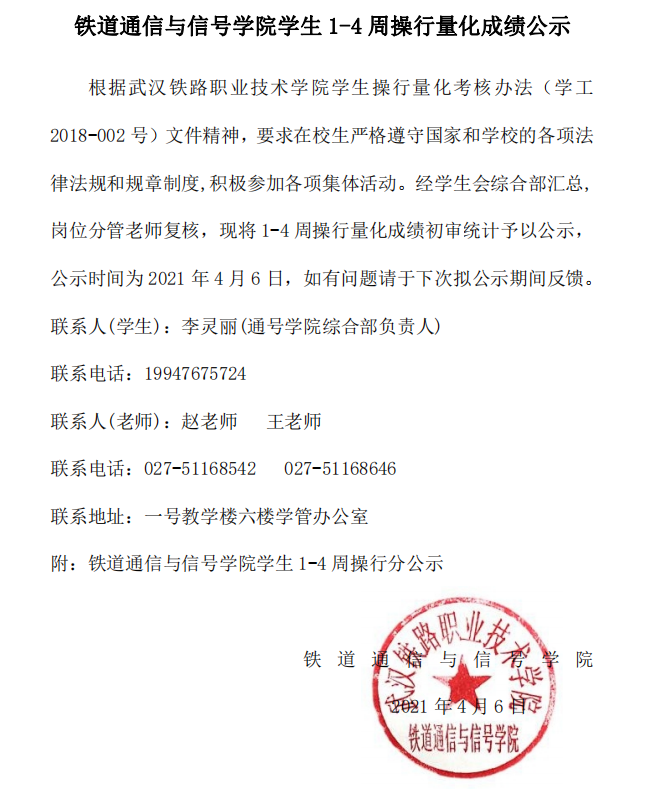 铁道通信与信号学院学生1-4周操行分公示
