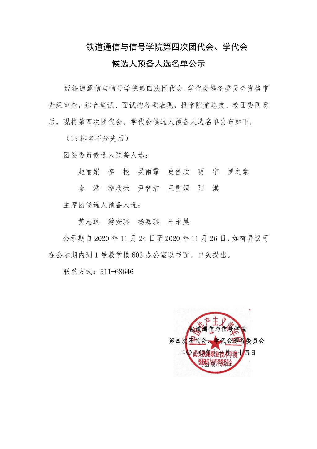 铁道通信与信号学院第四次团代会、学代会 候选人预备人选名单公示