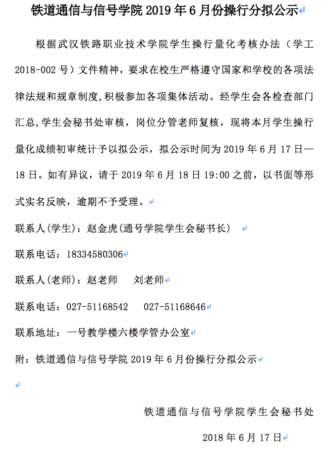 铁道通信与信号学院2019年6月份操行分拟公示