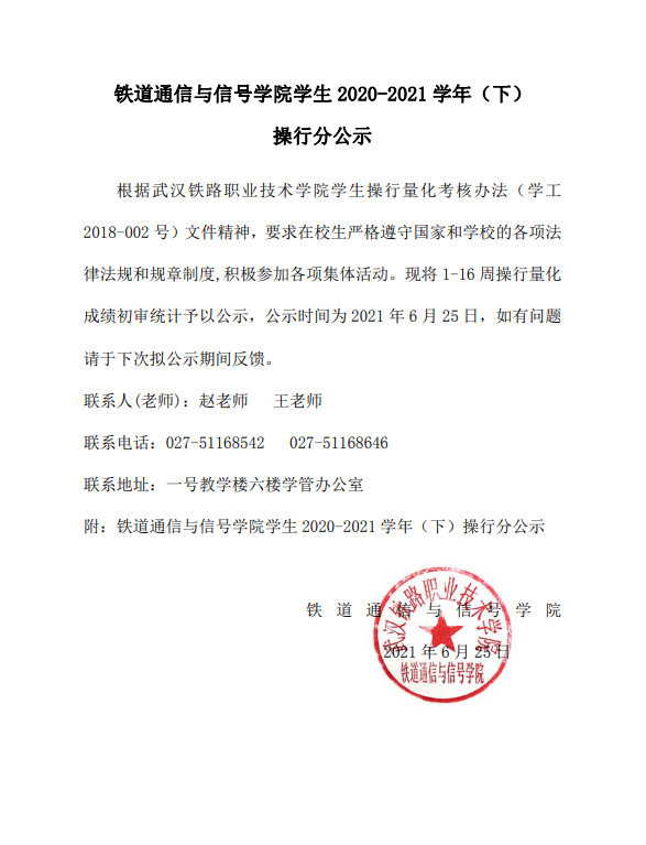 铁道通信与信号学院学生2020-2021学年(下)操行分公示