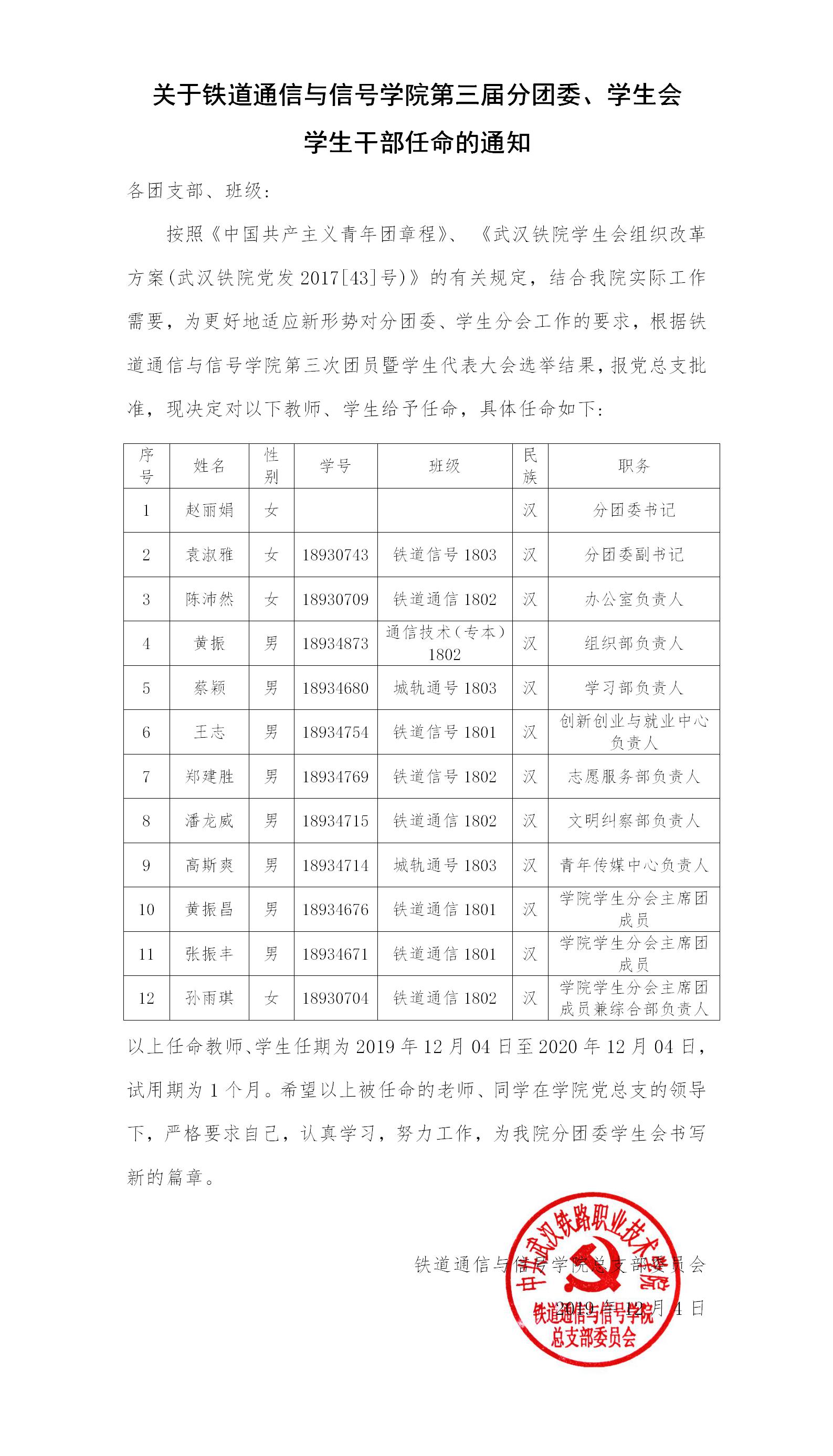 关于铁道通信与信号学院第三届分团委、学生会学生干部任命的通知