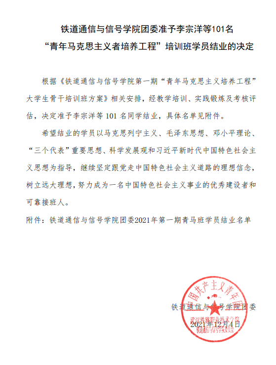 铁道通信与信号学院团委2021年第一期青马班学员结业名单公示
