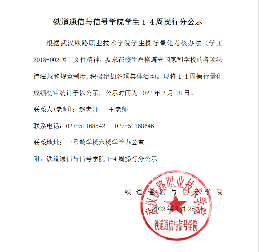 铁道通信与信号学院学生1-4周操行分拟公示