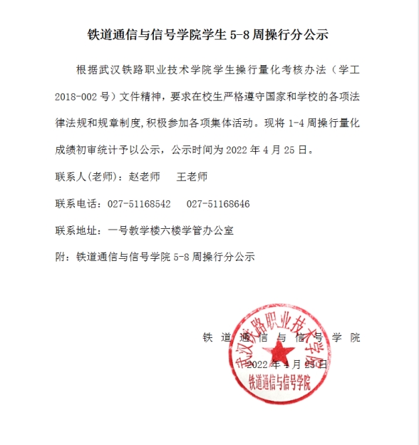 铁道通信与信号学院5-8周操行分拟公示
